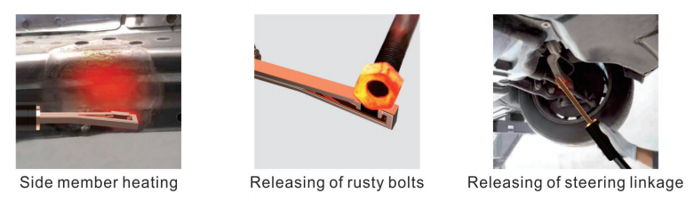 H8E is an induction heater which can release a powerful heating on metals instantly, equipped with water cooling system, it supports big heating power with energy saving. It can be applied directly to the metals (steel and aluminum) without the need to disassemble nearby heat-sensitive components. Chassis, axles, joint reinforcements, bolts, clamping rings, pins and heavier steel parts can be heated up for simple loosening,adjusting or straightening. also suitable to break down adhesives.